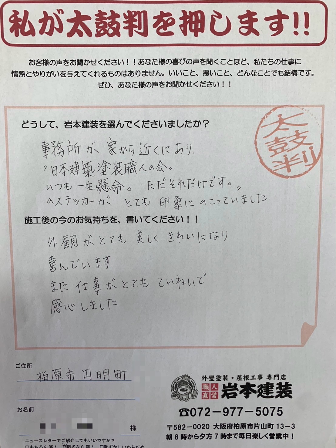 「今回は、当店ではじめての塗装工事でしたが、ご信頼くださり、誠にありがとうございました。