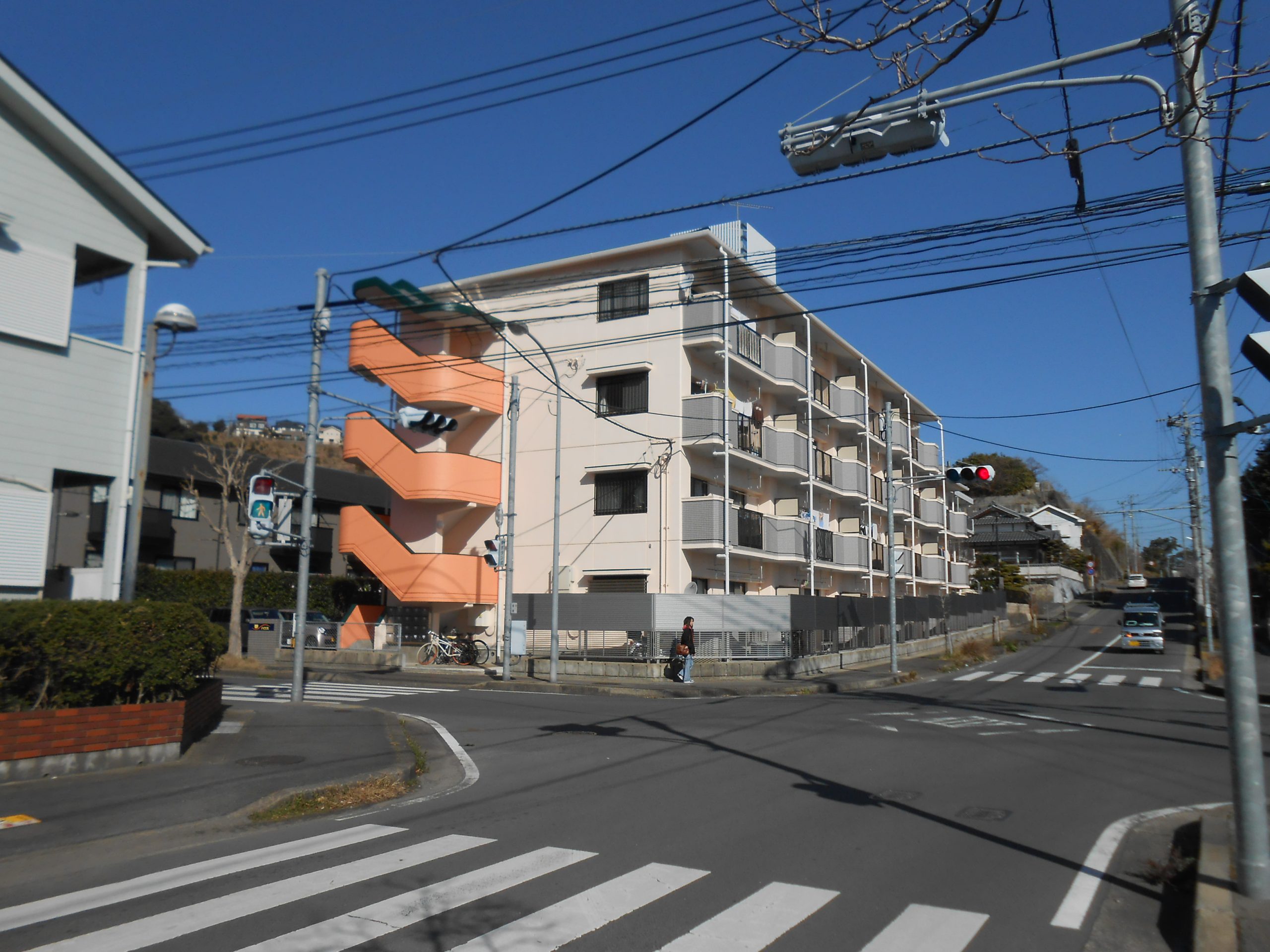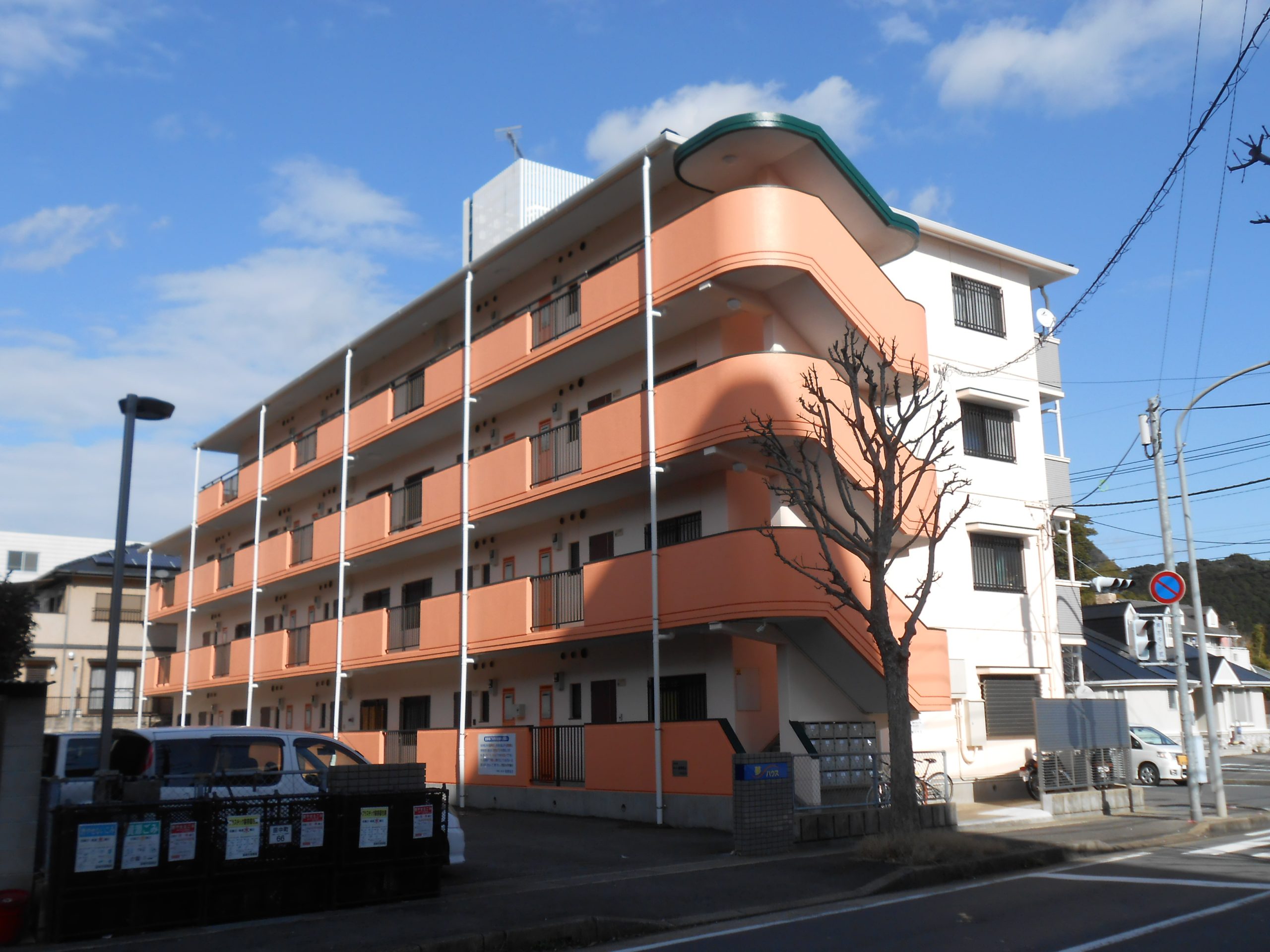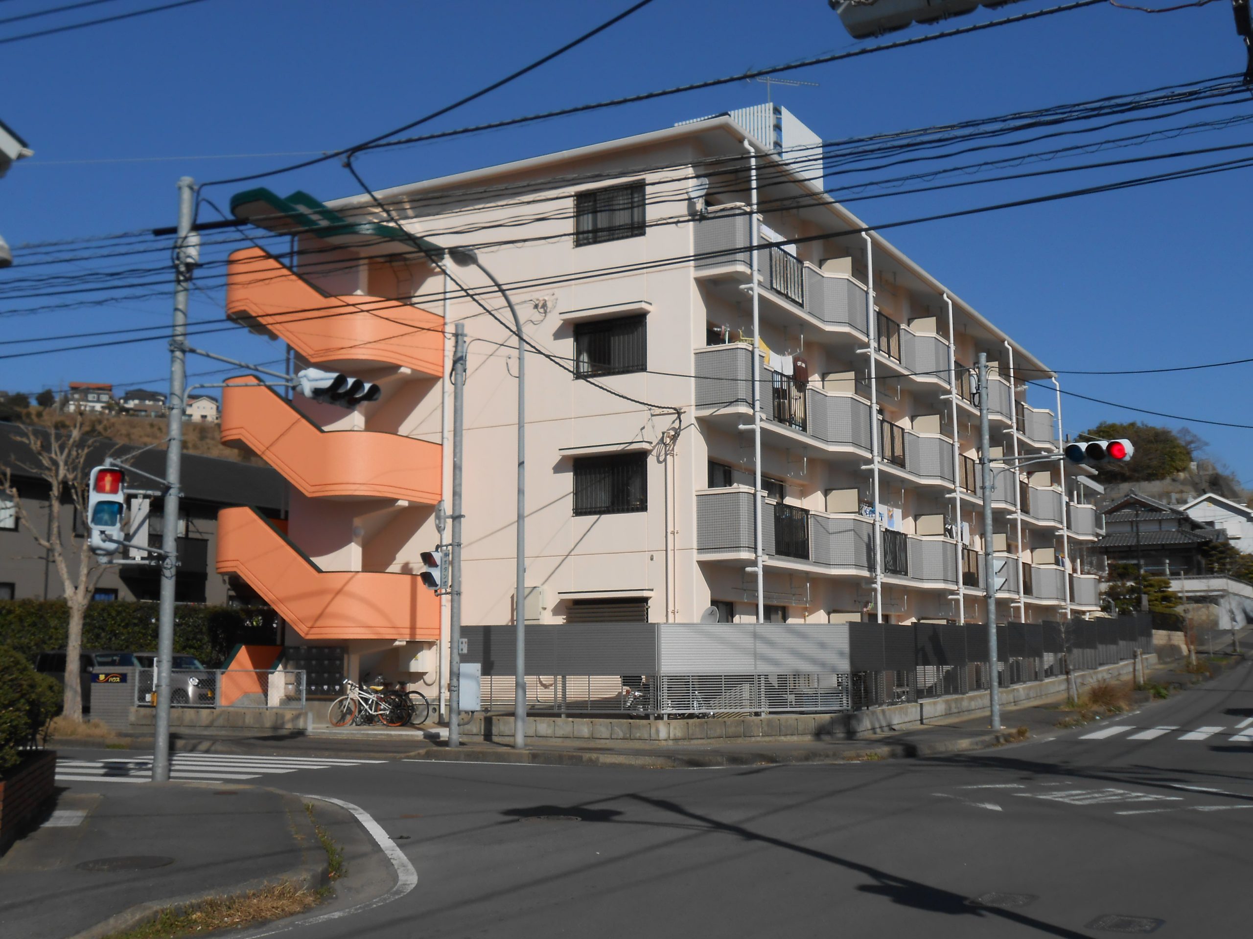 | デザイン塗装 | ・外壁 肌色(日塗工 17ー90D) ・手摺り壁 オレンジ色(日塗工 12-70淡) 濃緑色(日塗工 49-20H) |