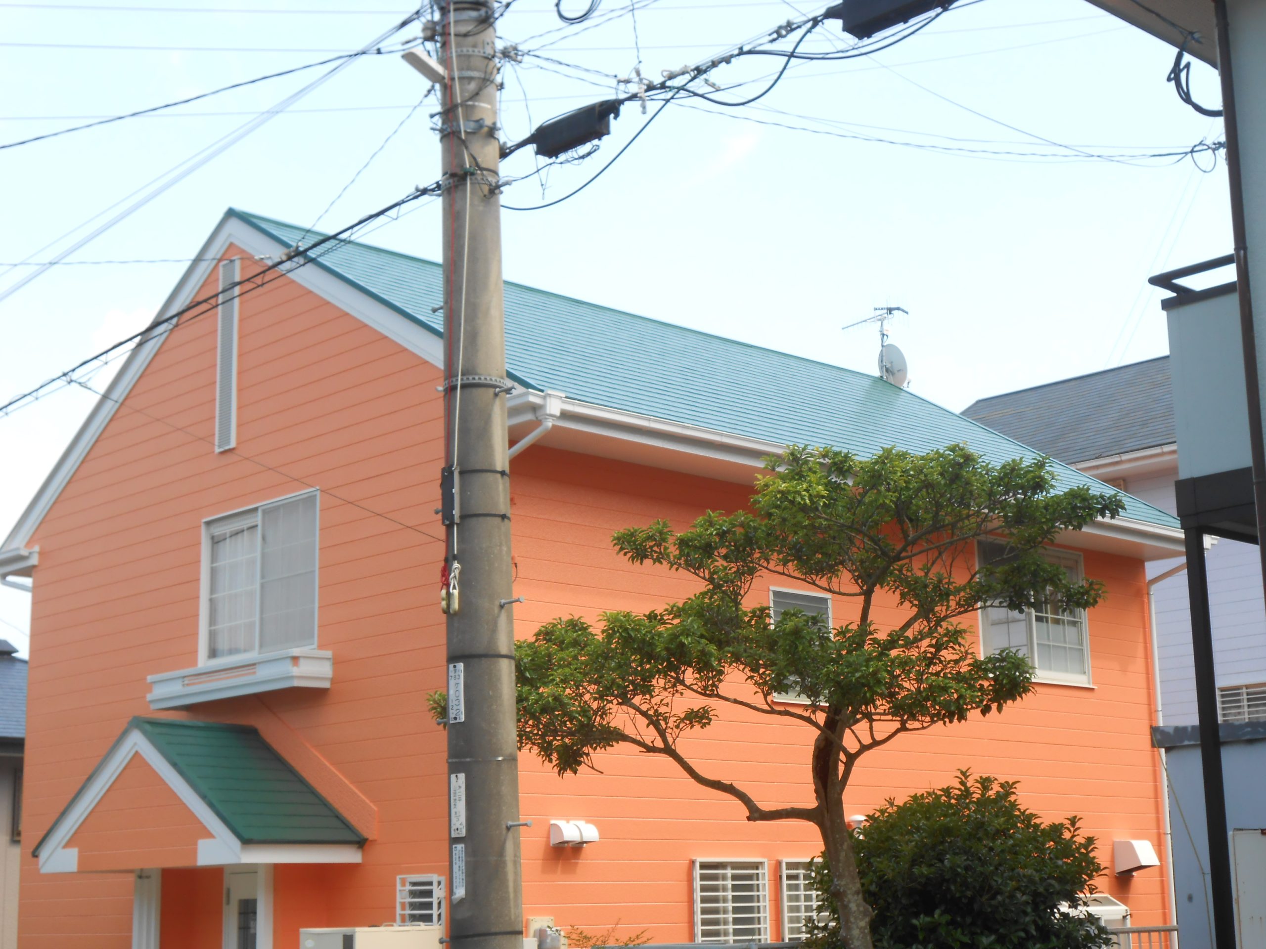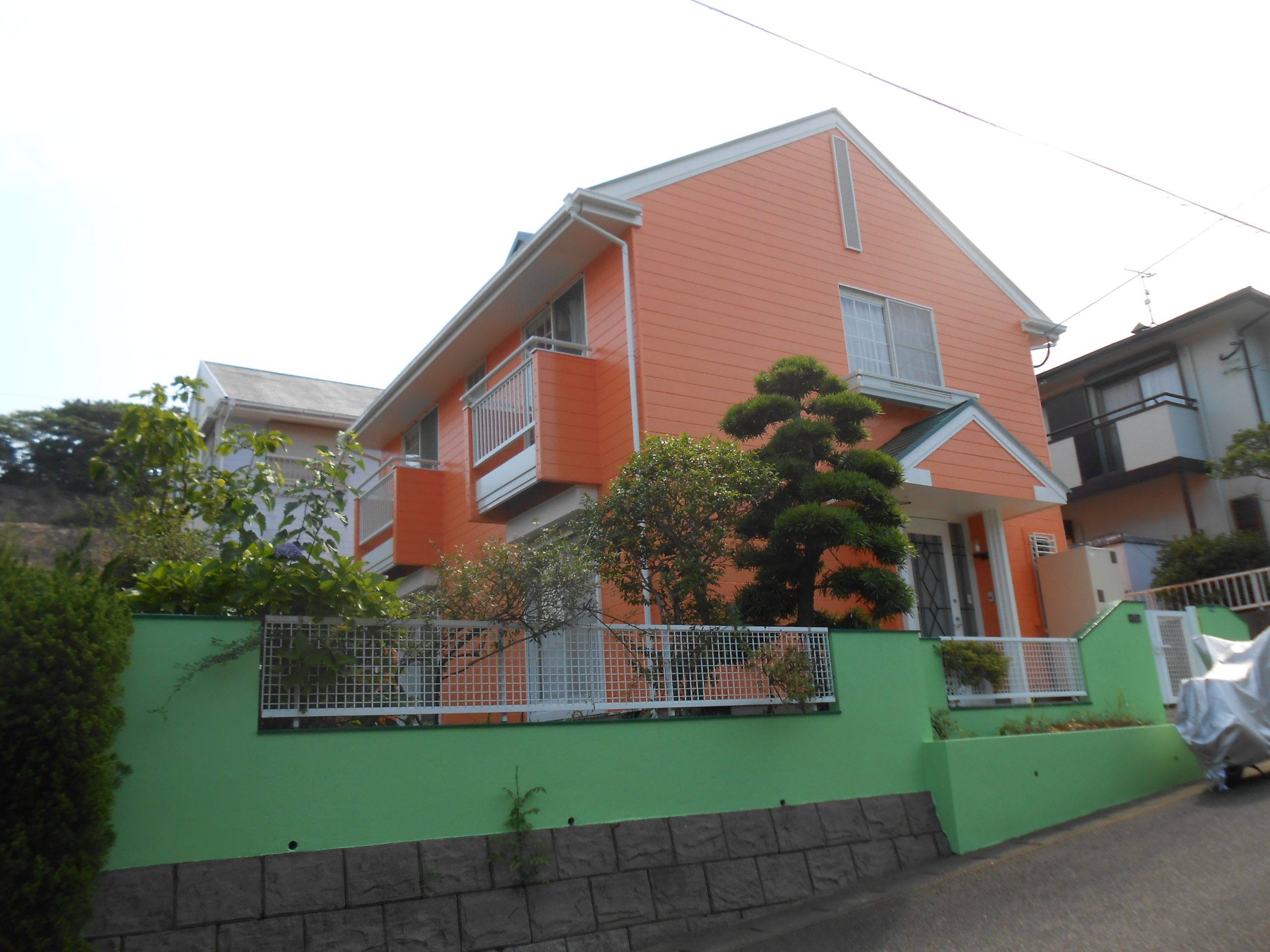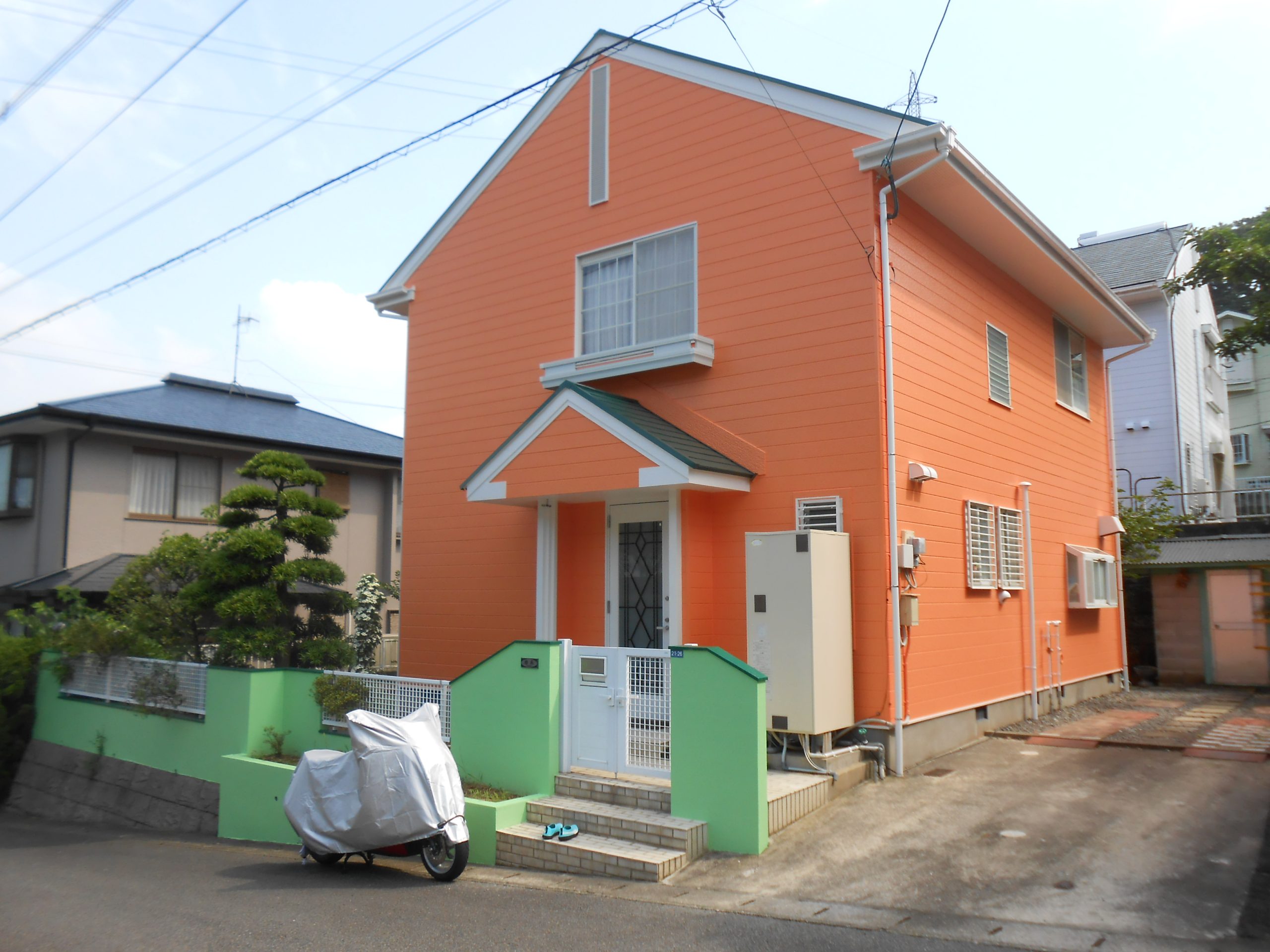 オレンジと緑色の色使い。周りの家より断然目立ちます!