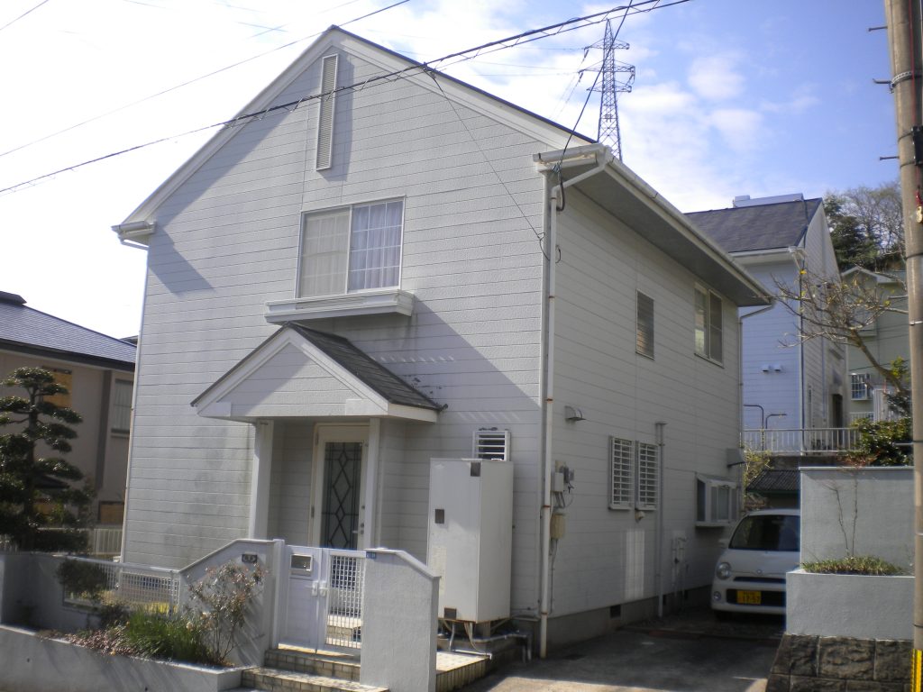 | 施工数量 | ・外壁 151.5m2 ・外塀 18.2m2 ・破風板、鼻隠し 40m ・軒裏 11.4m2 ・軒樋、竪樋 40m ・玄関扉 4.7m2 ・庇トタン、雨戸板 15.9m2 ・シャッターボックス、枠ほか鉄部 7.8m2 ・窓、ドア周りシーリング 69m ・外壁目地シーリング 30.9m ・コロニアル屋根 79.7m2 |